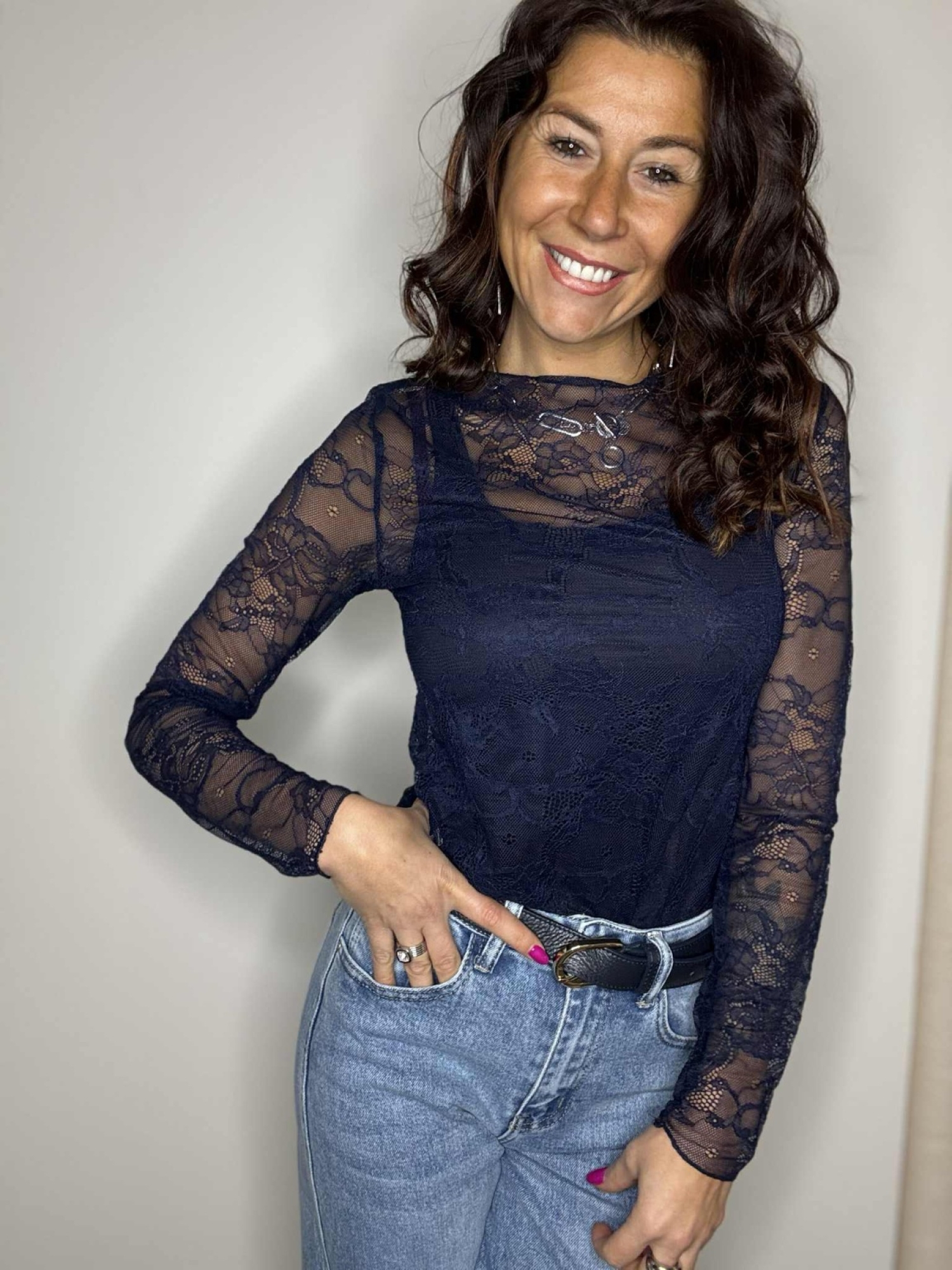 Blouse en dentelle raffinée, au style à la fois chic et intemporel. Confectionnée entièrement en dentelle délicate, elle séduit par son jeu de transparence subtil et son motif floral élégant.