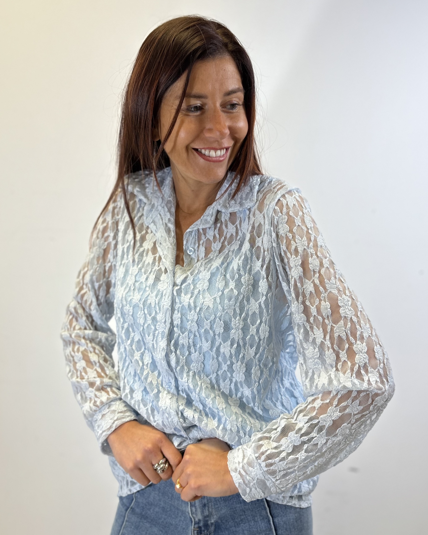 Blouse en dentelle à manches longues, au tombé fluide et légèrement ample pour une silhouette élégante et aérienne. Elle présente un col chemise classique avec une fermeture boutonnée discrète, tandis que la transparence délicate de la dentelle et les motifs floraux apportent une touche raffinée et féminine, idéale à porter sur un top pour un look chic et léger.