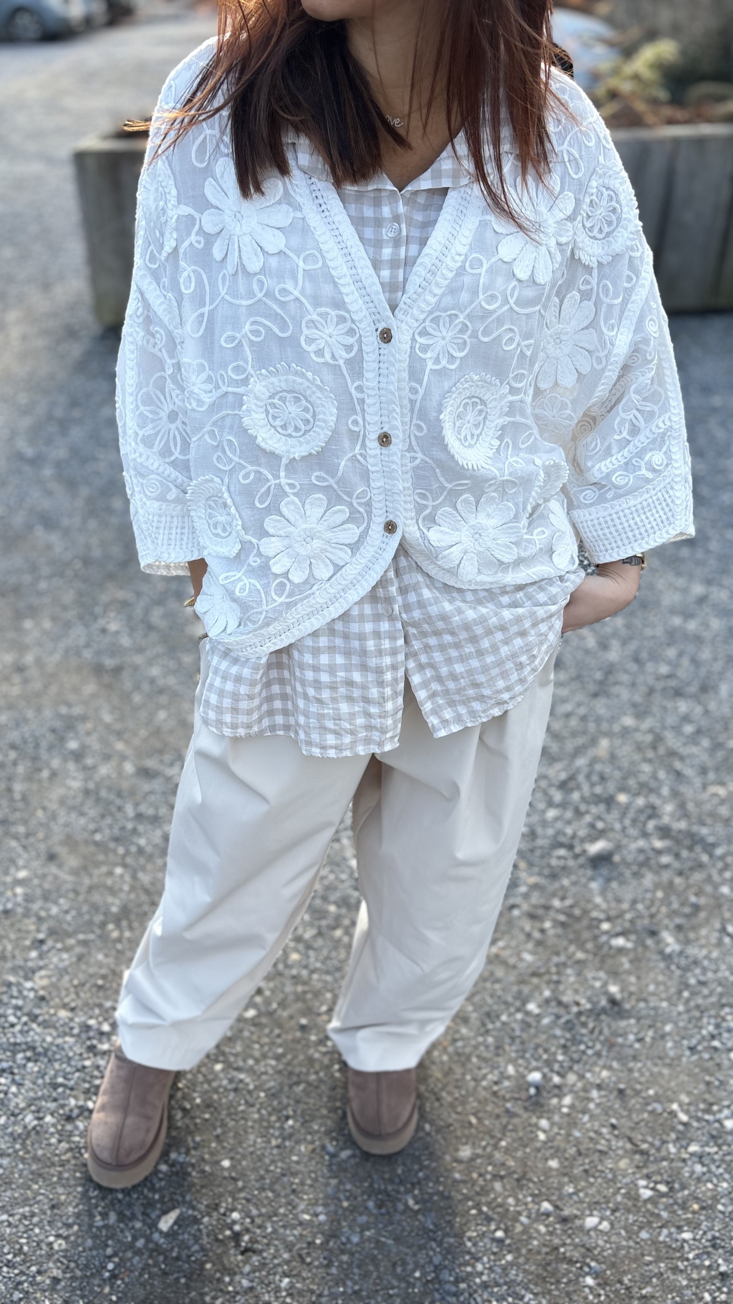 Blouse légère et raffinée, parfaite pour une allure douce et féminine. Son tissu délicatement travaillé laisse apparaître de superbes broderies florales en relief qui lui donnent tout son charme.