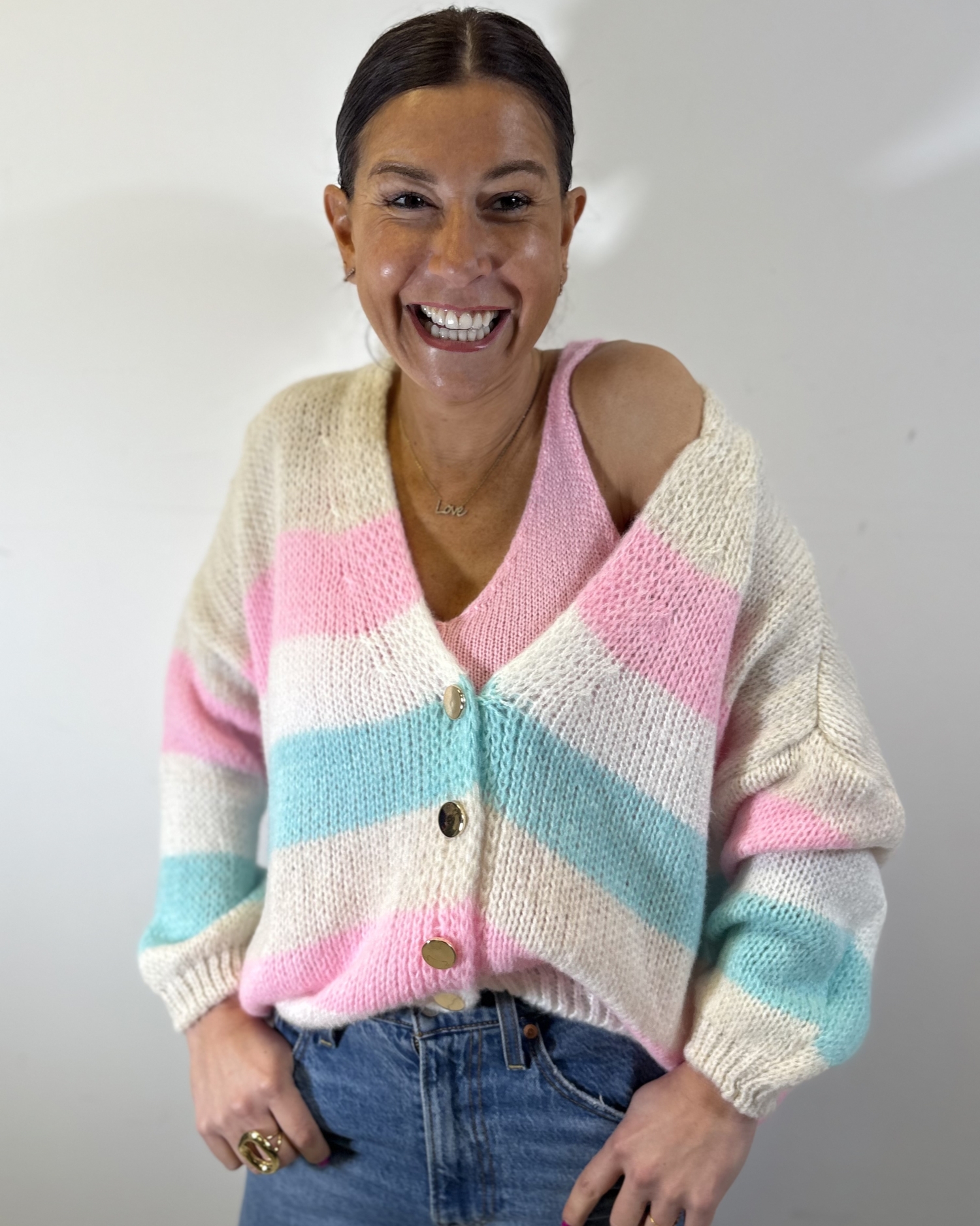 Ce gilet en maille douce séduit par sa coupe ample et enveloppante, idéale pour un style confortable tout en restant tendance. Sa maille légèrement duveteuse apporte un aspect chaleureux et une texture agréable au toucher.