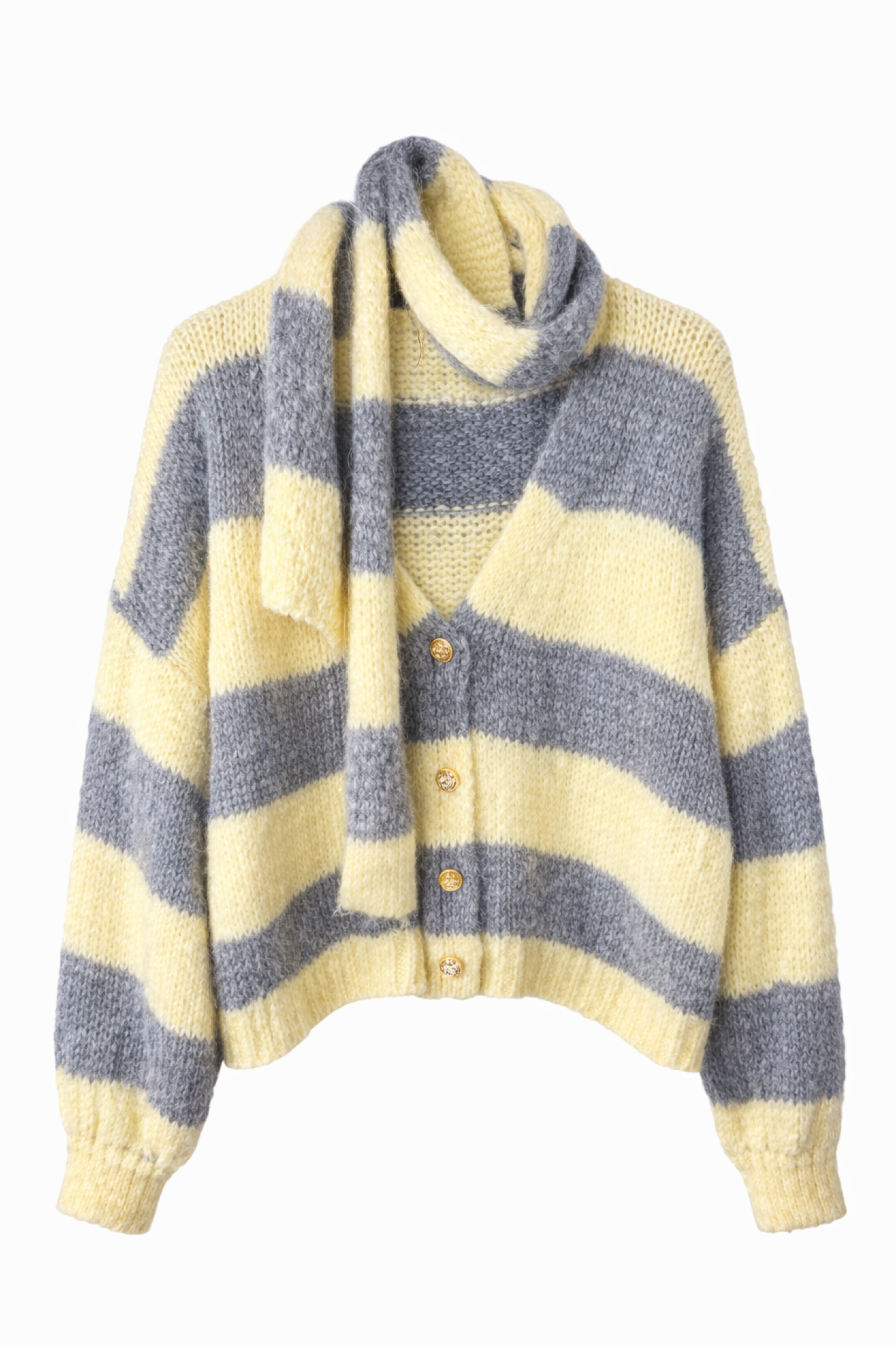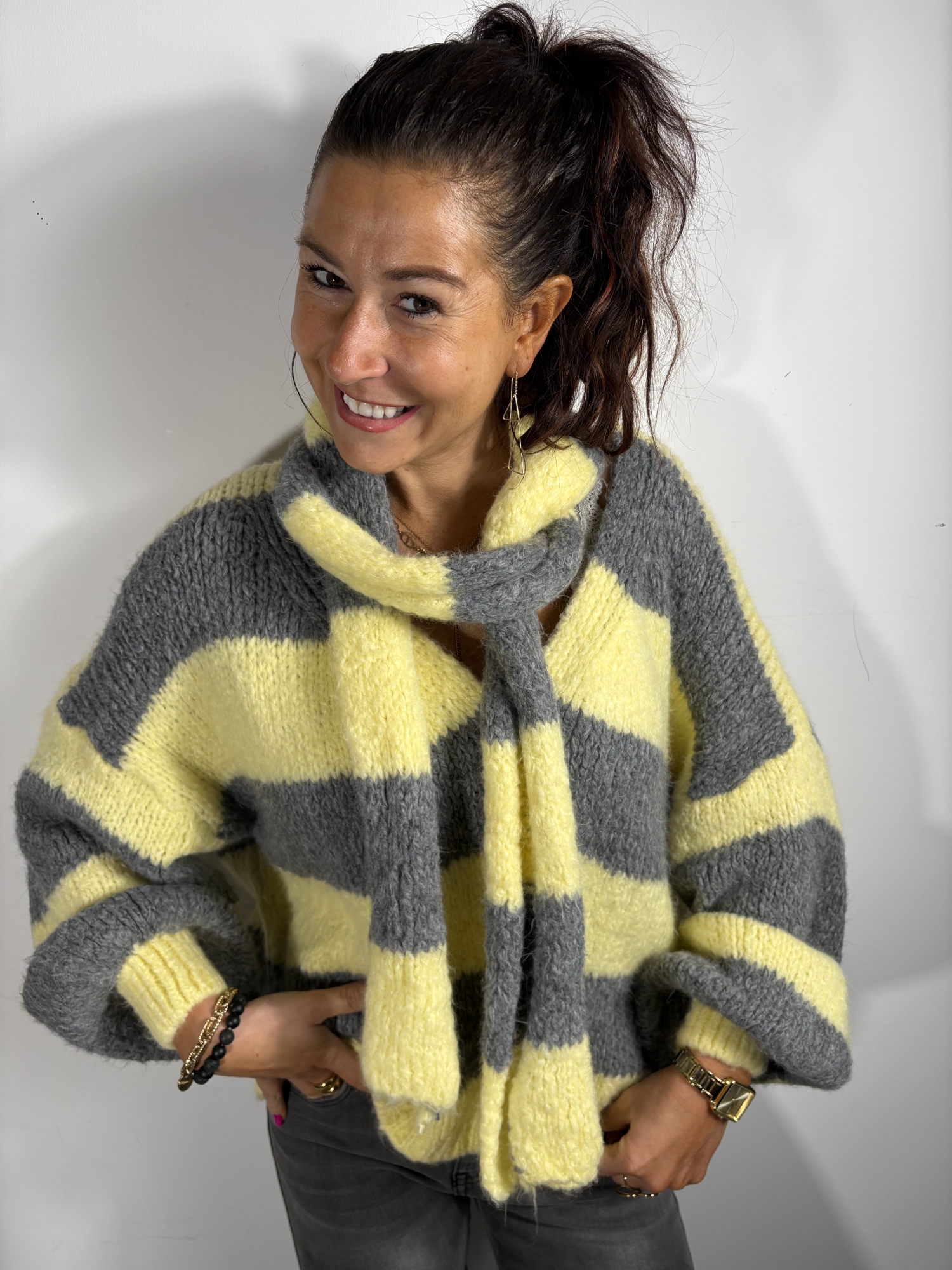 Ce pull séduit par son style cosy et tendance, parfait pour apporter du caractère à une tenue du quotidien. Il est accompagné de son écharpe assortie, non attachée, permettant de varier les styles selon les envies.
