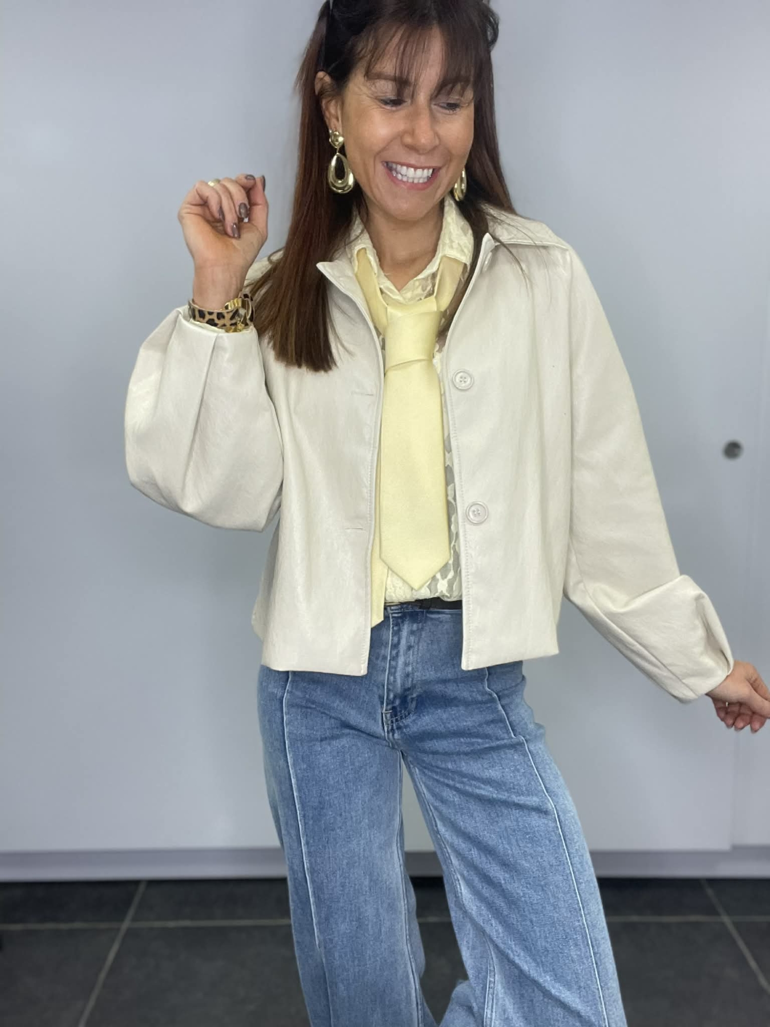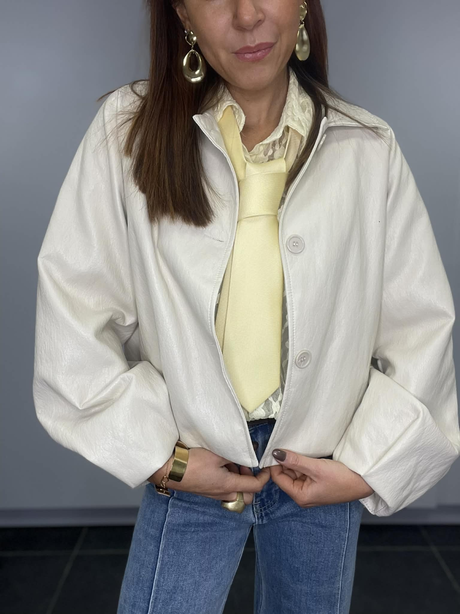 Cette veste courte au coloris crème apporte immédiatement une touche chic et lumineuse à la tenue. Son effet cuir souple lui donne un look moderne tout en restant très confortable à porter.