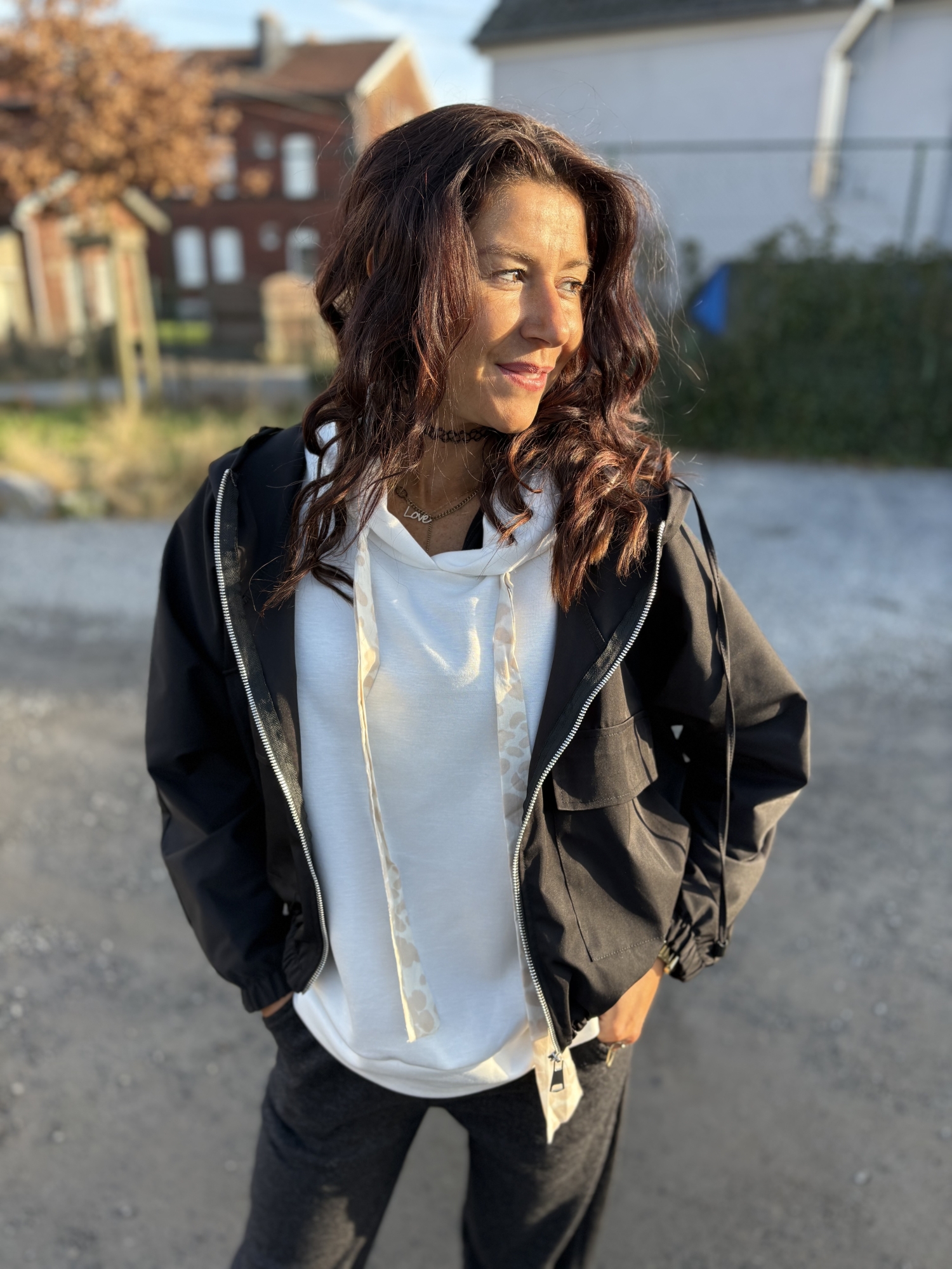 Cette veste noire coupe courte est la pièce idéale pour un look à la fois tendance, confortable et facile à porter au quotidien.