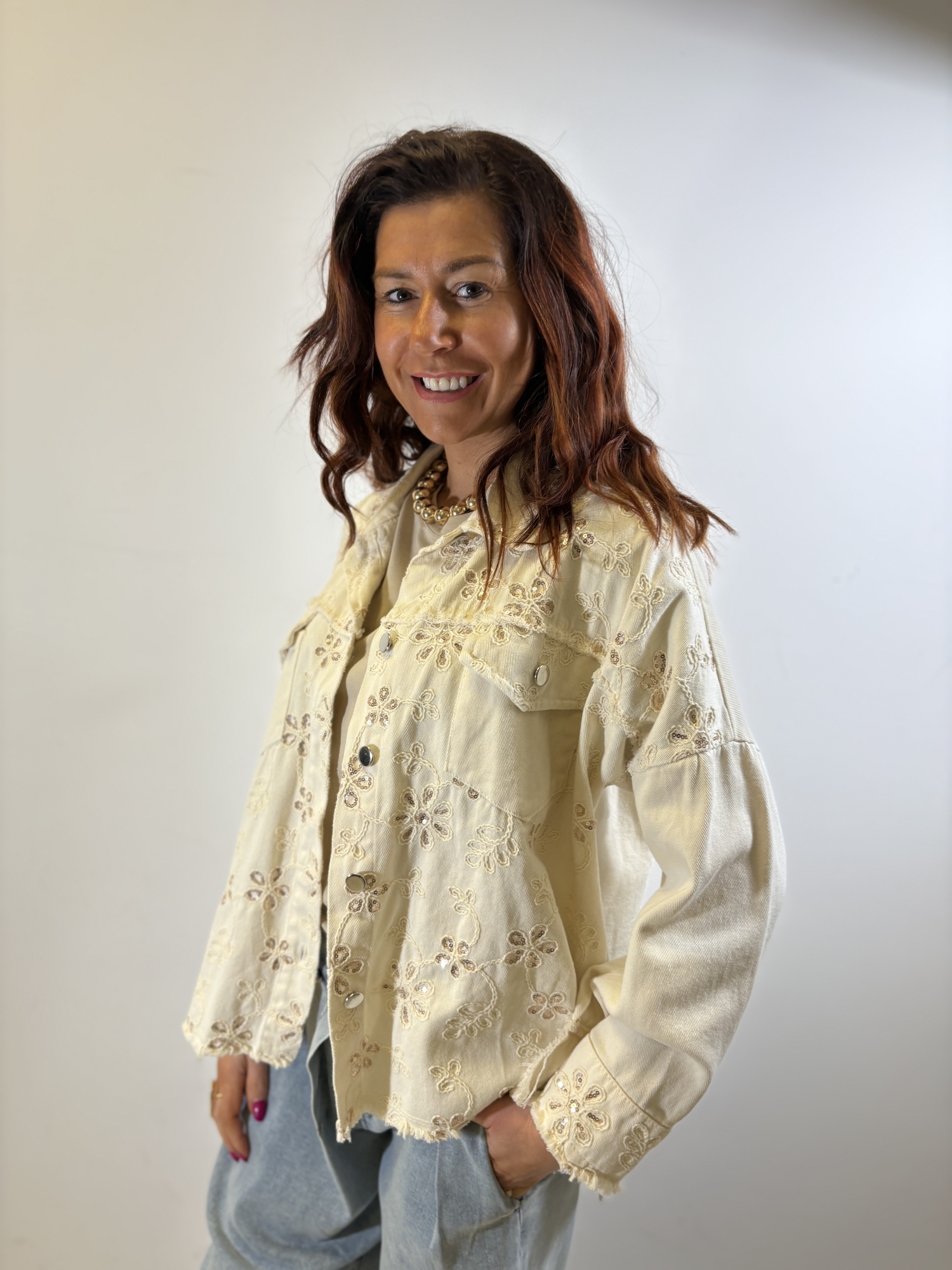 Veste courte au style casual chic, confectionnée dans une matière de type denim souple, offrant une tenue structurée tout en restant confortable. La coupe est légèrement ample avec des épaules tombantes, créant une silhouette moderne et décontractée.