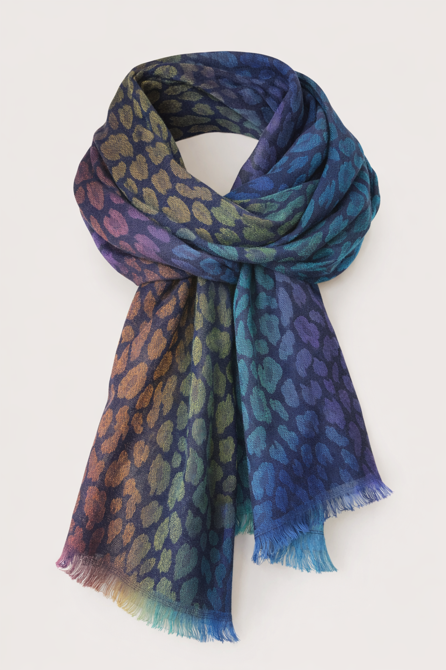 Apportez une touche de caractère et d’élégance à vos tenues avec cette écharpe au motif léopard revisité. Son superbe jeu de couleurs mêlant bleu, vert, violet et reflets dorés sublime instantanément votre look. Douce, légère et agréable à porter, elle s’enroule facilement autour du cou pour un rendu chic et moderne