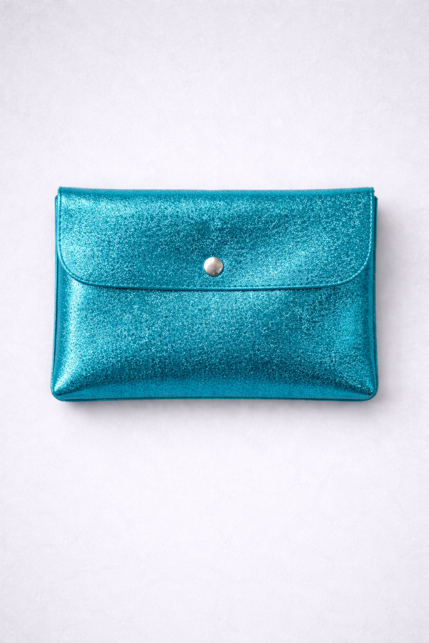 Pochette en cuir élégante couleur turquoise, idéale pour apporter une touche chic et lumineuse à une tenue. Sa texture légèrement brillante capte la lumière et donne un effet sophistiqué sans en faire trop.